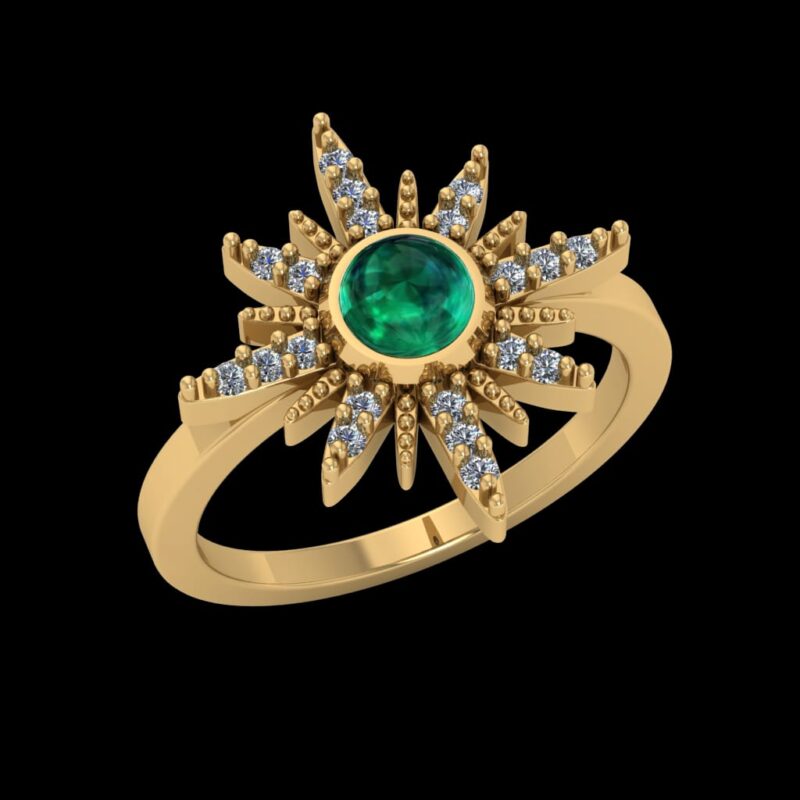 Sun shaped Green Stone Hidden Halo-Style Engagement Ring